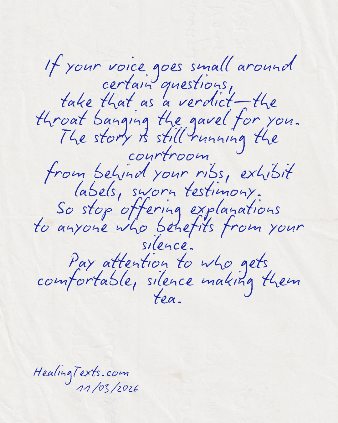 A small voice is often old evidence rising fast. Listen. The body keeps better records than your excuses. Notice who grows calm when you speak in half-truths and call that data.