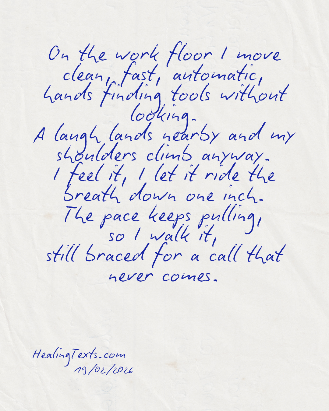 On the work floor I move clean, fast, automatic, hands finding tools without looking. A laugh lands nearby and my shoulders climb anyway. I feel it, I let it ride the breath down one inch.