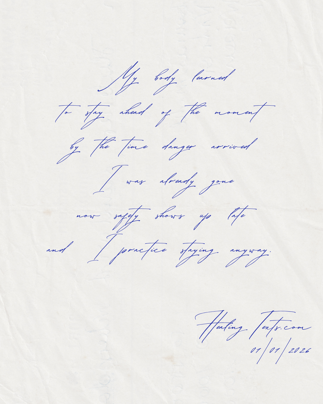 My body learned, to stay ahead of the moment. By the time danger arrived, I was already gone. Now safety shows up late, and I practice staying anyway.