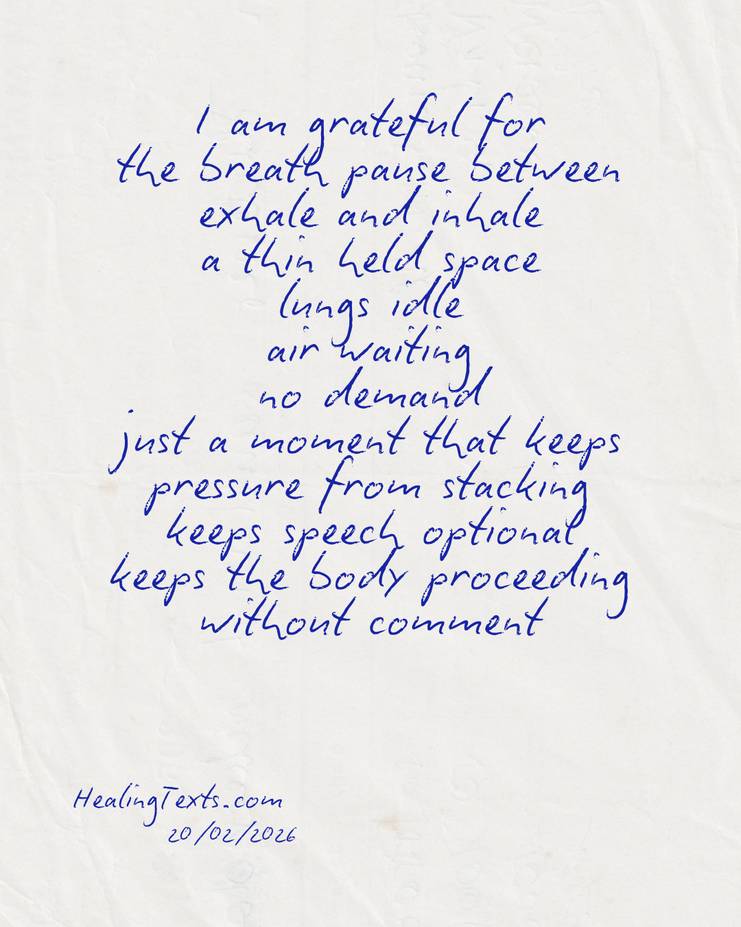 I am grateful for the breath pause between exhale and inhale. A thin held space. Lungs idle. Air waiting. No demand. Just a moment that keeps pressure from stacking.